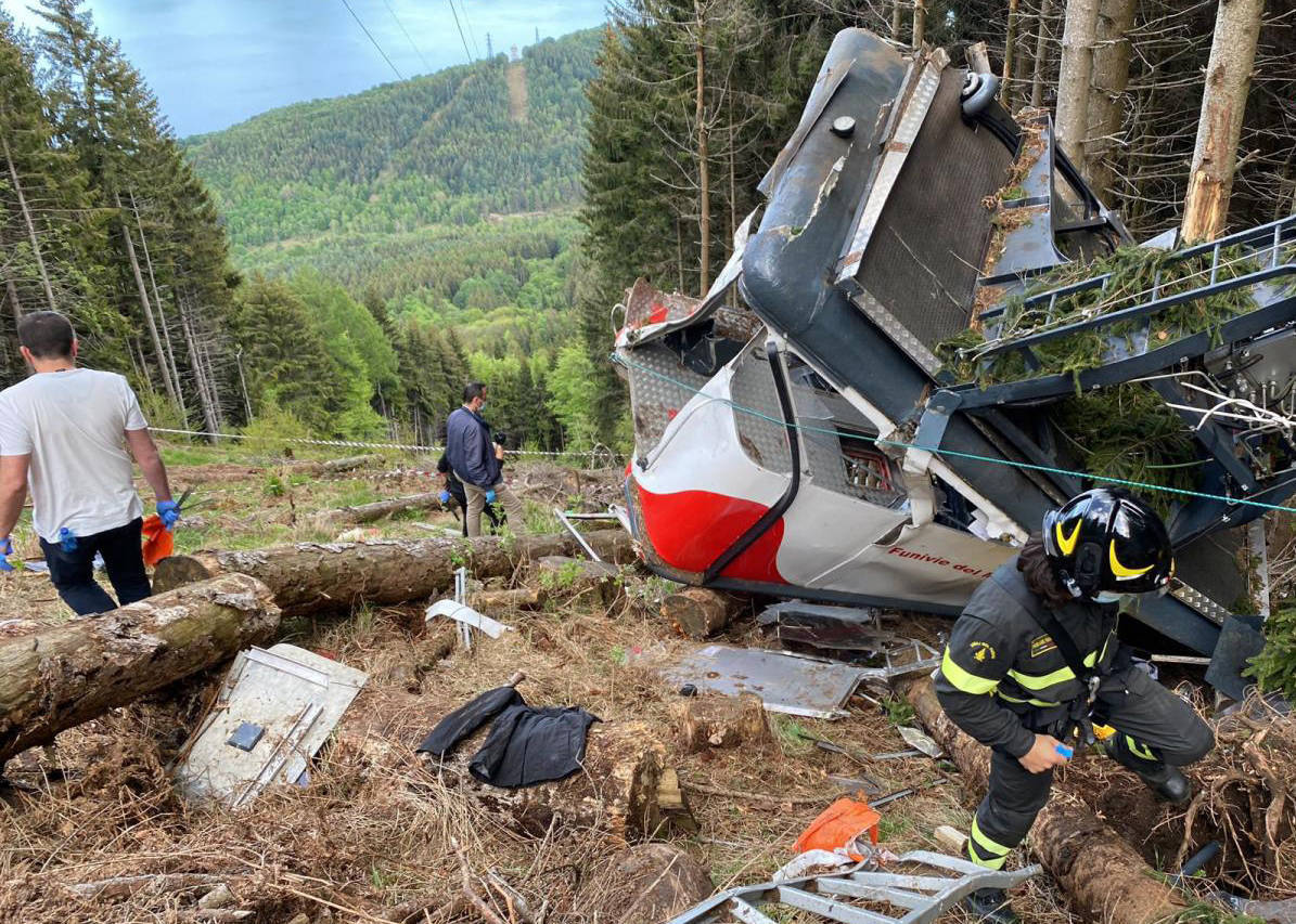 2021年5月23日,救援人员在意大利皮埃蒙特地区的缆车事故现场工作。新华社发意大利近年发生多起严重缆车事故,最近一次在今年4月,南部那不勒斯市附近一条观光缆车线路发生轿厢坠落事故,造成4人遇难、1人重伤。2021年,意大利北部连接马焦雷湖与附近山峰的缆车线路发生轿厢坠地事故,造成14人死亡。(乔颖)