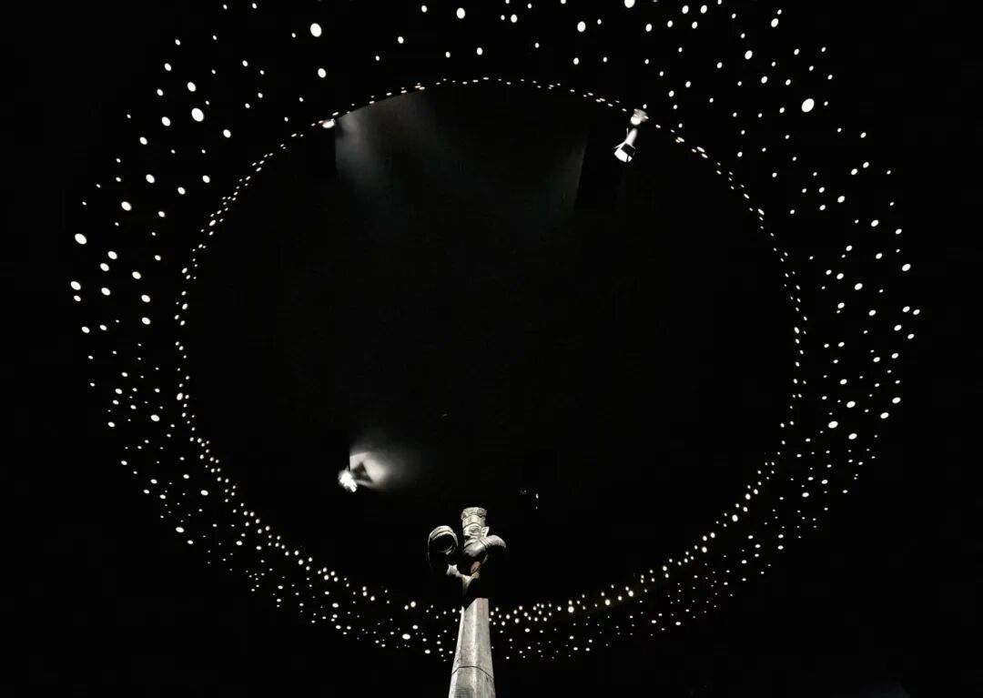 展览中,三星堆博物馆藏戴冠纵目面具与中国国家博物馆藏戴冠纵目面具,迎来一场历史性聚首。这是自1986年三星堆祭祀坑发掘以来,两件标志性青铜面具的首次同台亮相。